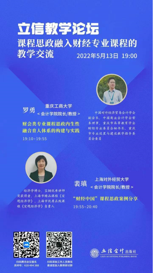 罗勇院长作为“立信教学论坛”首位特邀主讲嘉宾,在云端为来自全国一百余所高校的财经教育同仁,做了题为“财会类专业课程思政内生性融合育人体系的构建与实践”的开坛报告,并开展了教学学术交流。罗院长在报告中,以习近平总书记关于“其他各门课都要守好一段渠、种好责任田,使各类课程与思想政治理论课同向同行,形成协同效应”、“要坚持显性教育和隐性教育相统一,挖掘其他课程和教学方式中蕴含的思想政治教育资源,实现全员全程全方位育人”的重要论述为根本遵循,从总体思路、教学设计、案例分析三个方面,基于我校财会类专业课程思政内生性融合育人体系研究的最新理论成果,立足国内兄弟院校尤其是我校财经类专业课程思政建设的典型实践经验,由理入实、理实融合地系统介绍了财会类专业课程思政内生性融合育人的基本原则、主要举措、教学设计,并结合首批国家级“一流本科课程”、首批国家级“课程思政示范课程”——我校“基础会计学”课程的建设实践,深度解析了课程思政“金课”的内生性融合建设典型案例。