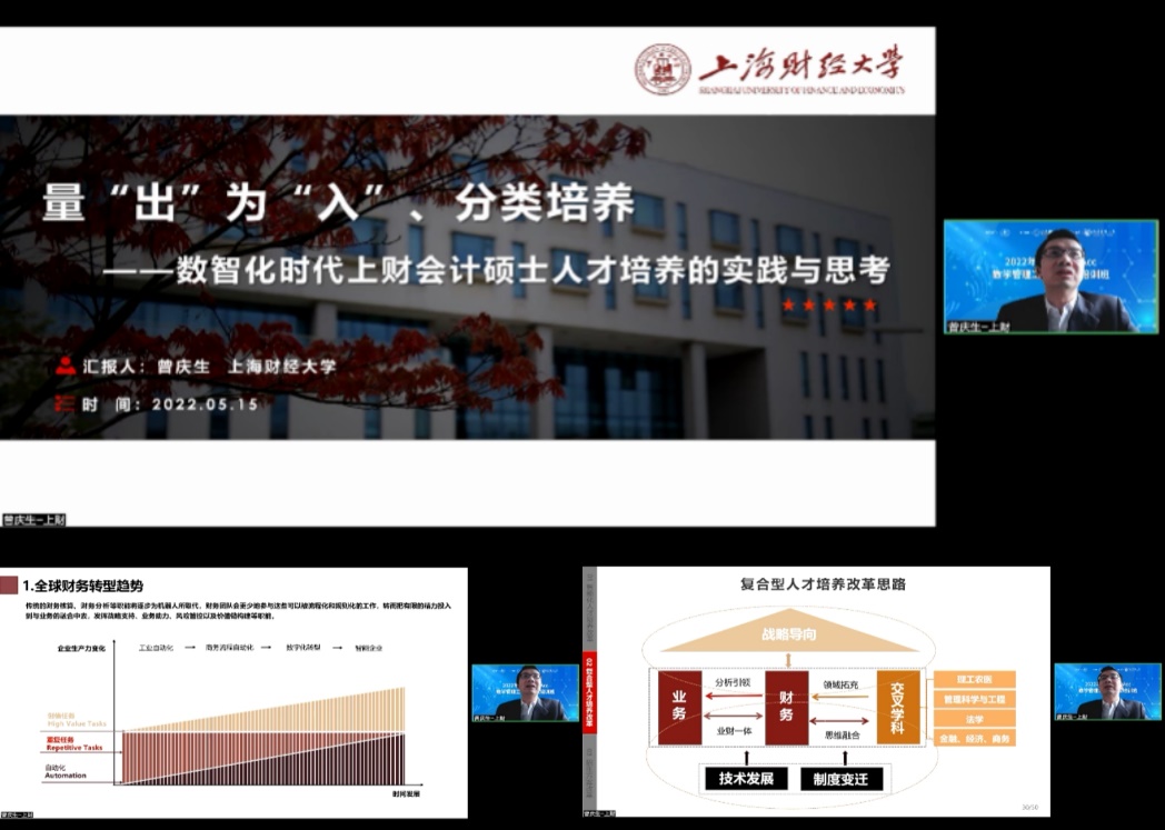 上海财经大学的曾庆生教授做了以“量‘出’为‘入’、分类培养——数智化时代上财会计硕士人才培养的实践与思考”为题的汇报。曾庆生教授认为,目前智能化教学改革的四大战略在于:重塑智能化人才培养体系、打造智能化实验教学平台、组建智能化师资团队和拓展智能化实践场景。