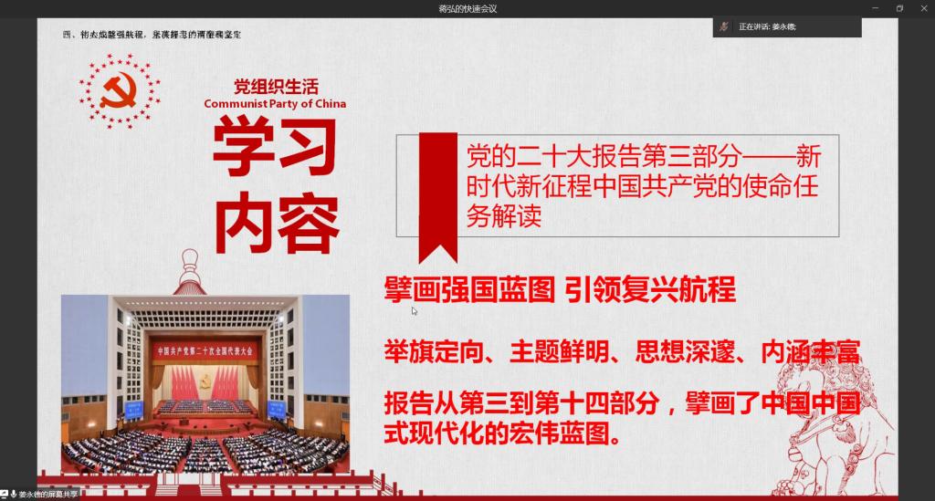 为认真学习、深刻领会、全面贯彻党的二十大报告精神,从2022年10月28日起,365英国上市公司教工一支部开启了主题名为“守正创新展大国风采,踔厉奋发赴星辰大海”学习党的二十大报告精神系列活动。10月28日是该系列活动的第一次,活动由教工一支部书记蒋弘主持,一支部全体党员参加。