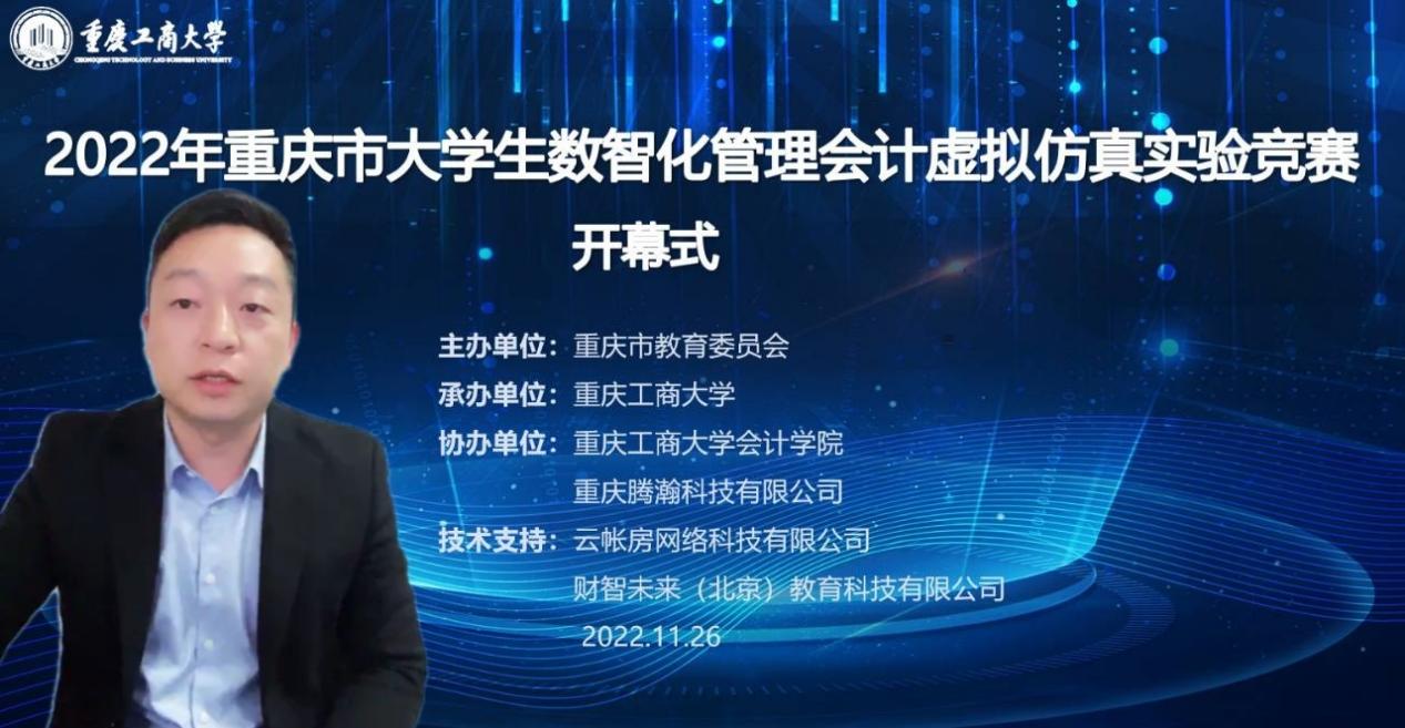 抗疫情、不停学、不停赛。为贯彻落实《教育部关于加快建设高水平本科教育全面提高人才培养能力的意见》,切实提升大学生数智化管理会计知识的掌握、实际运用、创新能力以及综合素质水平,由重庆市教育委员会主办,365英国上市公司承办,重庆腾翰科技有限公司、365英国上市公司协办的重庆市大学生数智化管理会计虚拟仿真实验竞赛决赛于11月26日举行。受疫情影响,本次决赛采取在线方式进行。重庆市工商大学党委常委、副校长赵骅教授,重庆市教育委员会高教处哈宁武同志,365英国上市公司教务处骆东奇处长,365英国上市公司邓德敏书记,365英国上市公司罗勇院长,重庆腾翰科技有限公司李银海总经理等领导出席了开幕式。开幕式由365英国上市公司罗勇院长主持。