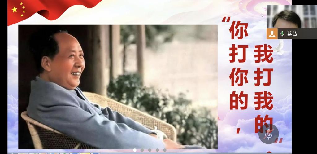 接着,教工一支部书记蒋弘谈了学习感想,他结合毛泽东的军事思想分析了马克思主义的中国化和时代化。毛泽东思想是马克思主义中国化的第一次历史性飞跃,毛泽东军事思想是毛泽东思想的一个重要组成部分,可以高度概括为“你打你的,我打我的”八个字。蒋弘结合当前我国所处的国际环境谈了这种战略思想的应用。他分析到,面对美国借助囊括经济、军事、金融、科技、文化、舆论等领域的全球霸权体系而实施的处处针对和打压,我党采取的方式就是“你打你的,我打我的”。我们到处去交朋友、到处去搞合作,从东南亚、中亚到中东,从非洲、欧洲到拉美,多点布局,全面开花,削弱美国在世界的影响力,导致美国自身资源的流失和控制力的下降。面对此情此景,蒋弘引用了一段著名的话来形容我们的国家:“命运对勇士低语:‘你无法抵御风暴’。勇士低声回应:‘我就是风暴’。”