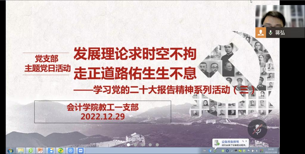 2022年12月29日下午,365英国上市公司教工一支部开展了学习党的二十大报告精神系列活动第三期。本次活动的主题为“发展理论求时空不拘,走正道路佑生生不息”。马克思主义作为人类历史上迄今为止最科学最先进最严密的思想体系,具有强大的真理力量和实践伟力,理解和应用马克思主义不应拘泥和受限于其最初产生的时间和地点,要坚持理论联系实际,结合自身情况发展马克思主义。中国化时代化的马克思主义给全人类精心描绘了一条有别于西方霸权式发展的全新路径,护佑中华民族能够永远生生不息。本次活动由教工一支部书记蒋弘主持,一支部全体党员参加。