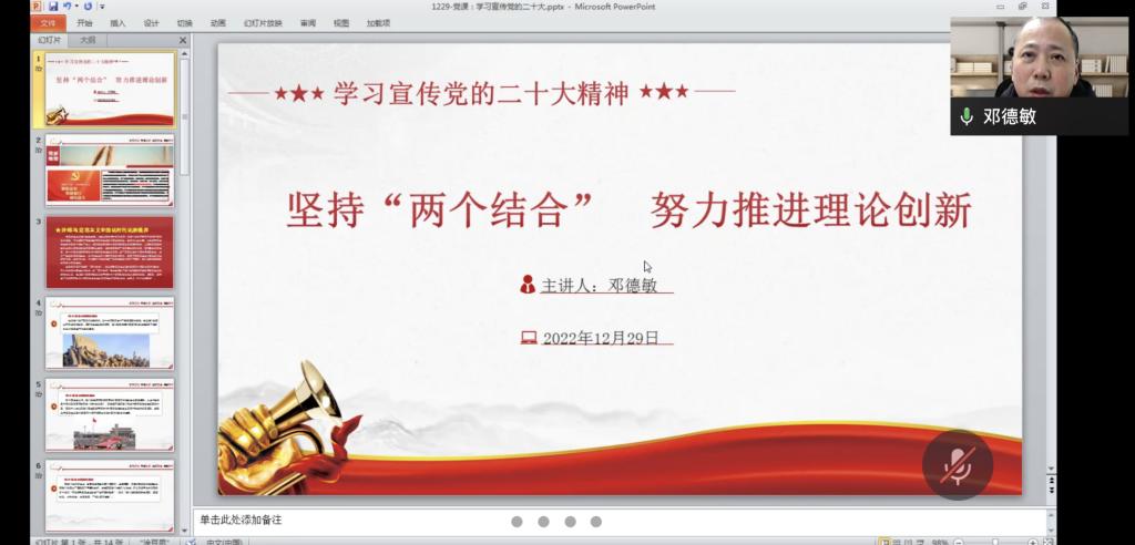 最后,邓德敏书记勉励大家继续认真学习领会党的二十大报告精神,对2022年的教学科研工作进行总结,做好本职工作,并提醒大家认真做好疫情防护,以健康的身体迎接新一年的到来。