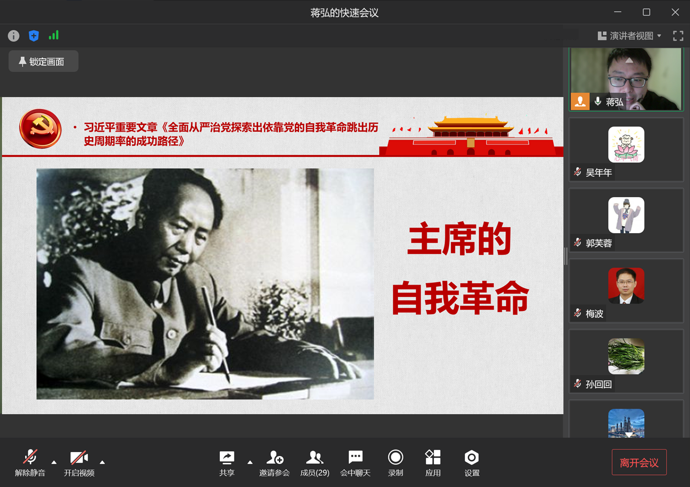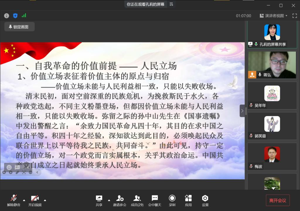 蒋弘领学结束之后,孔莉老师分享了题为“认识自我革命”的学习感想。她指出,首先,自我革命的价值前提是人民立场,因为价值立场表征着价值主体的原点与归宿,而中国共产党自成立之日起就始终秉承人民立场;其次,自我革命的基本方法是批评与自我批评,这既是党的优良传统与作风,也在党光辉的自我革命奋斗史中贯穿始终。