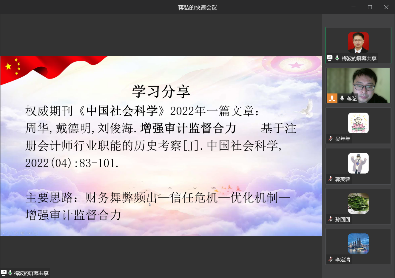 接下来的“好…好…学习”专栏,梅波老师分享了权威期刊《中国社会科学》2022年刊发的《增强审计监督合力——基于注册会计师行业职能的历史考察》。公司财务舞弊大案要案的出现,暴露了注册会计师行业的信誉和信任危机。针对国内外注册会计师审计面临的现实困境,需要着力解决制约我国财会监督和审计监督作用发挥的重点及难点问题。通过梅波的分享,党员同志们对审计监督合力有了更深入的认识,深刻体会到优化审计监督合力机制对我国治理体系以及治理能力现代化的重要作用。