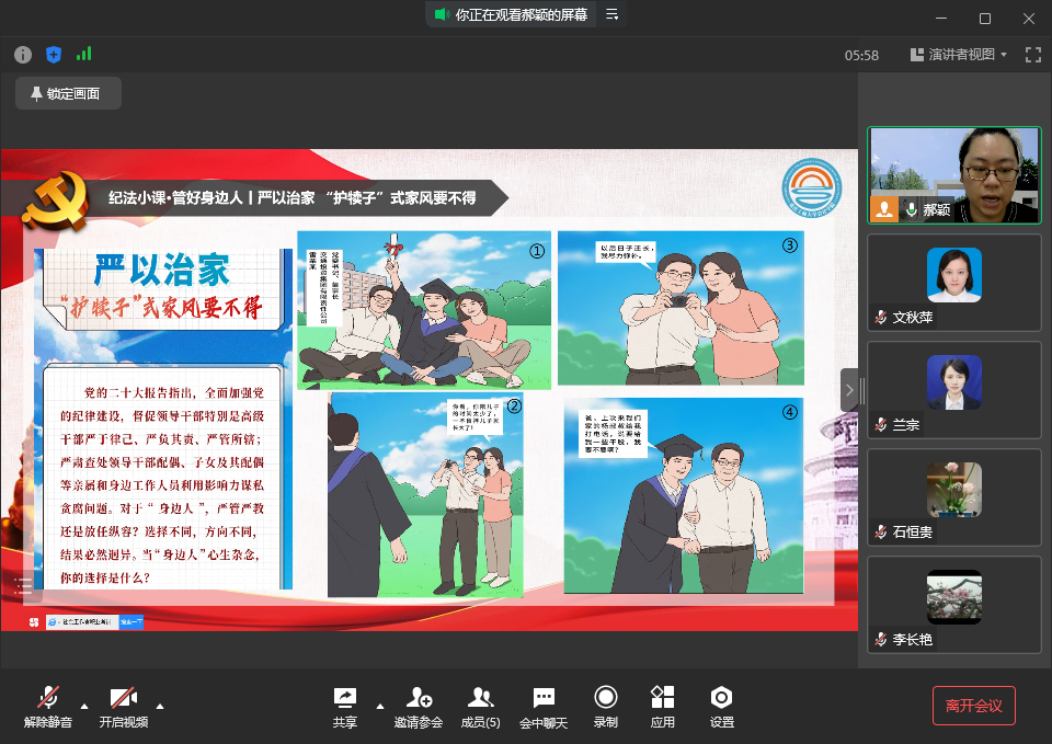 郝书记生动为与会人员讲述了漫画《纪法小课•管好身边人丨严以治家 “护犊子”式家风要不得》,提出推动作风建设必须坚持“三严”:严以修身、严以用权、严以律己,以“严以治家”促进家风建设。文秋萍也表示身为家长,首先必须具备“红线”“底线”意识,严于律己,其次应当以身作则,以实际行动教育影响子女,推动子女的健康成长。