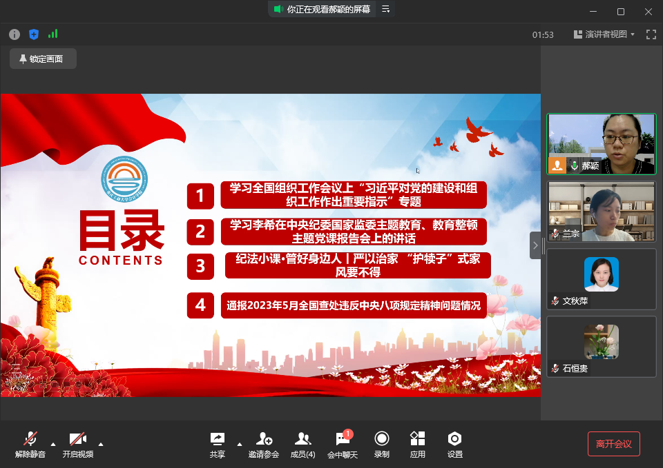 本次会议集中学习了全国组织工作会议上“习近平对党的建设和组织工作作出重要指示”专题,李希在中央纪委国家监委主题教育、教育整顿主题党课报告会上的讲话,观看并讨论了漫画《纪法小课•管好身边人丨严以治家 “护犊子”式家风要不得》和通报2023年5月全国查处违反中央八项规定精神问题情况。
