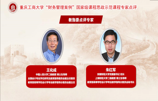 全国会计专业学位研究生教育指导委员会副主任委员、教育部高等学校会计学专业教学指导分委员会副主任、中国会计学会副会长兼会计教育专业委员会副主任、中国人民大学博士生导师王化成教授 ,教育部高等学校会计学专业教学指导分委员会秘书长、中国高等教育学会教学研究分会常务理事、安徽财经大学党委副书记、校长朱红军教授两位教育部教指委专家在观看和审阅了我校“财务管理案例”课程思政建设的相关视频和文档资料后,对我校“财务管理案例”国家级课程思政示范课程建设的经验范式及其实践成效予以了充分的肯定和高度的认可。