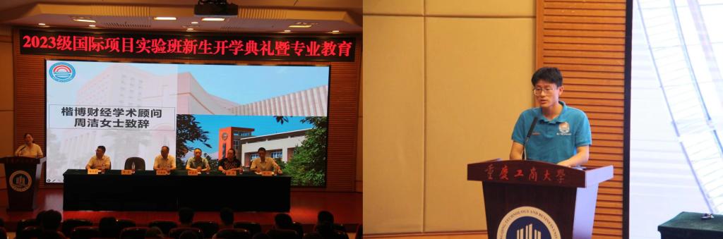 接着,2023级CIMA/ACCA实验班新生代表李奇欣同学进行发言。他表达了自己初为工商学子的激动心情,也为我们分享了自己的未来规划。他说,作为国际项目班学子,我们应该培养出独特的国际视野与家国情怀,要有清晰的职业规划,保持自律并着重于人生观和价值观的塑造。希望2023级CIMA/ACCA实验班的同学们活出自我、拼出精彩。