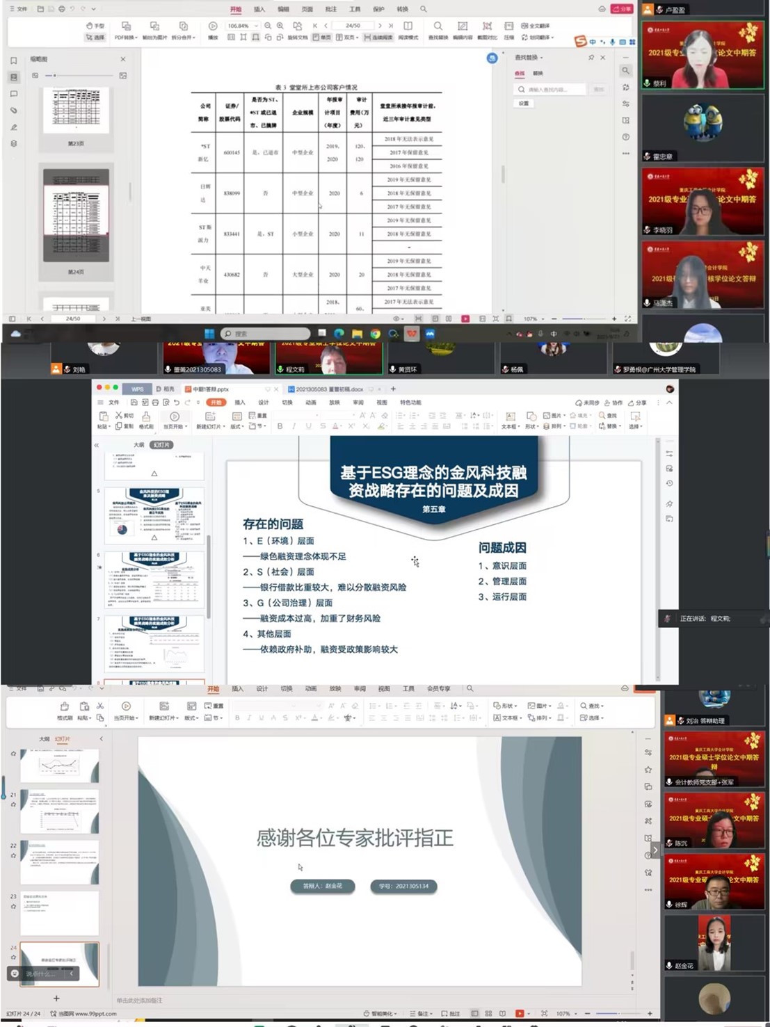2023年9月23日,我院2021级研究生学位论文中期考核答辩在博智楼顺利举行。来自重庆大学、西南政法大学、西南财经大学、重庆理工大学等高校的15名校外导师,来自重庆市审计局、浪潮集团、信永中和会计师事务所等单位的15名事业导师和365英国上市公司15名硕士导师们组成了答辩专家组,2021级187名研究生通过线上或线下的方式参加本次论文中期考核答辩。