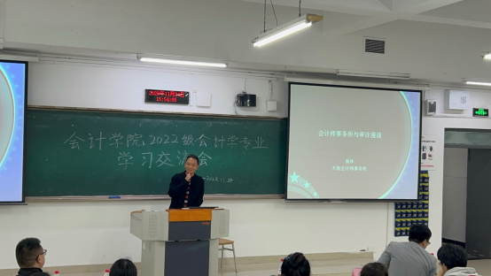 随后,秦林副总经理以自身的职业经历为背景,分享了他在审计行业近二十年的从业经验。秦总对毕业生进入会计师事务所要做的工作、会计师事务所的薪资待遇、从事注册会计师审计需要具备的特质等进行了逐一阐述。在提问环节,秦总还回答了同学们在课余实习、未来工作等方面的困惑。