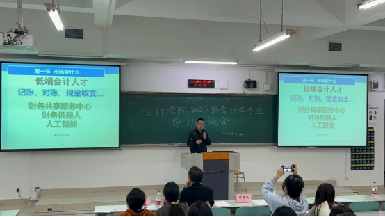 最后,蒋主任从“市场要什么”“正在做什么”“还能做什么”“能够干什么”四个方面,结合会计学专业和会计学专业(智能会计方向)本科培养方案,探讨了会计学专业的职业规划。他从新时代会计人员应掌握的知识和提升的技能、培养方案中为培养基础到高阶会计能力而设置的课程,讲到走职业发展道路可以考取的众多证书、毕业生通常的职业发展目标等。蒋主任还给同学们提出了做计划、提高写作能力、学会调整心态、不局限在财会领域就业等建议。