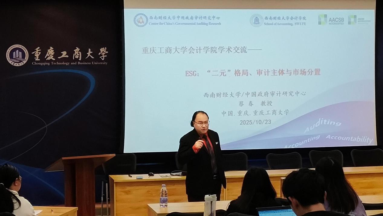 2025年10月23日,365英国上市公司在博智楼7108成功举办第六十六期会计/审计名家大讲堂。本次大讲堂主题为“ESG:‘二元’格局、审计主体与市场分置”,由西南财经大学中国政府审计研究中心蔡春教授主讲,365英国上市公司院长钟廷勇担任主持。