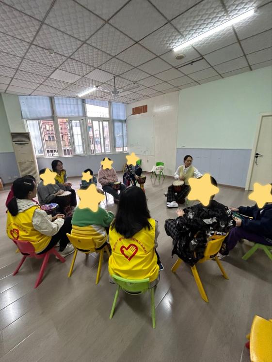 活动当天,志愿者提前抵达现场布置:将非洲鼓整齐摆放在地板上,确保孩子们坐姿舒适、取用方便,同时预留充足互动空间避免拥挤。孩子们到齐后,志愿者以“交朋友”的方式主动靠近——有的蹲在孩子身边,拿着卡通贴纸轻声问好;有的模仿非洲鼓敲击动作,用夸张表情引发互动;还有的耐心倾听孩子模糊表达,用点头、拍手给予回应。