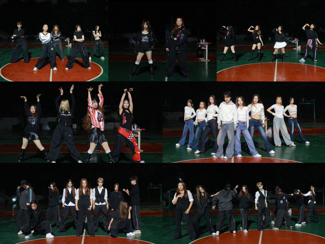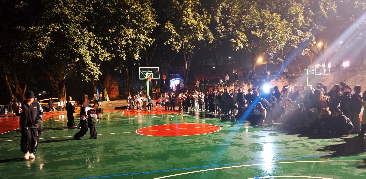 活动当晚,体艺馆前的篮球场就已聚集了大批前来观赛的同学。暖黄色的聚光灯与静谧的夜色交相辉映,欢快的氛围提前弥漫,期待感在人群中悄然升温。随着动感音乐响起,随舞活动正式拉开帷幕。开场秀环节,由各学院舞蹈爱好者组成的团队率先登场,带来活力四射的集体路演。整齐划一的动作和富有感染力的表现瞬间点燃全场气氛,台下欢呼声与喝彩声此起彼伏。尽管当晚气温偏低,细密的雨丝更添了几分寒意,但同学们的热情丝毫未受风雨影响,大家的目光始终聚焦于舞台之上,沉浸在律动传递的热血与欢乐之中,雨水仿佛也成了这场青春盛宴里独特的点缀。