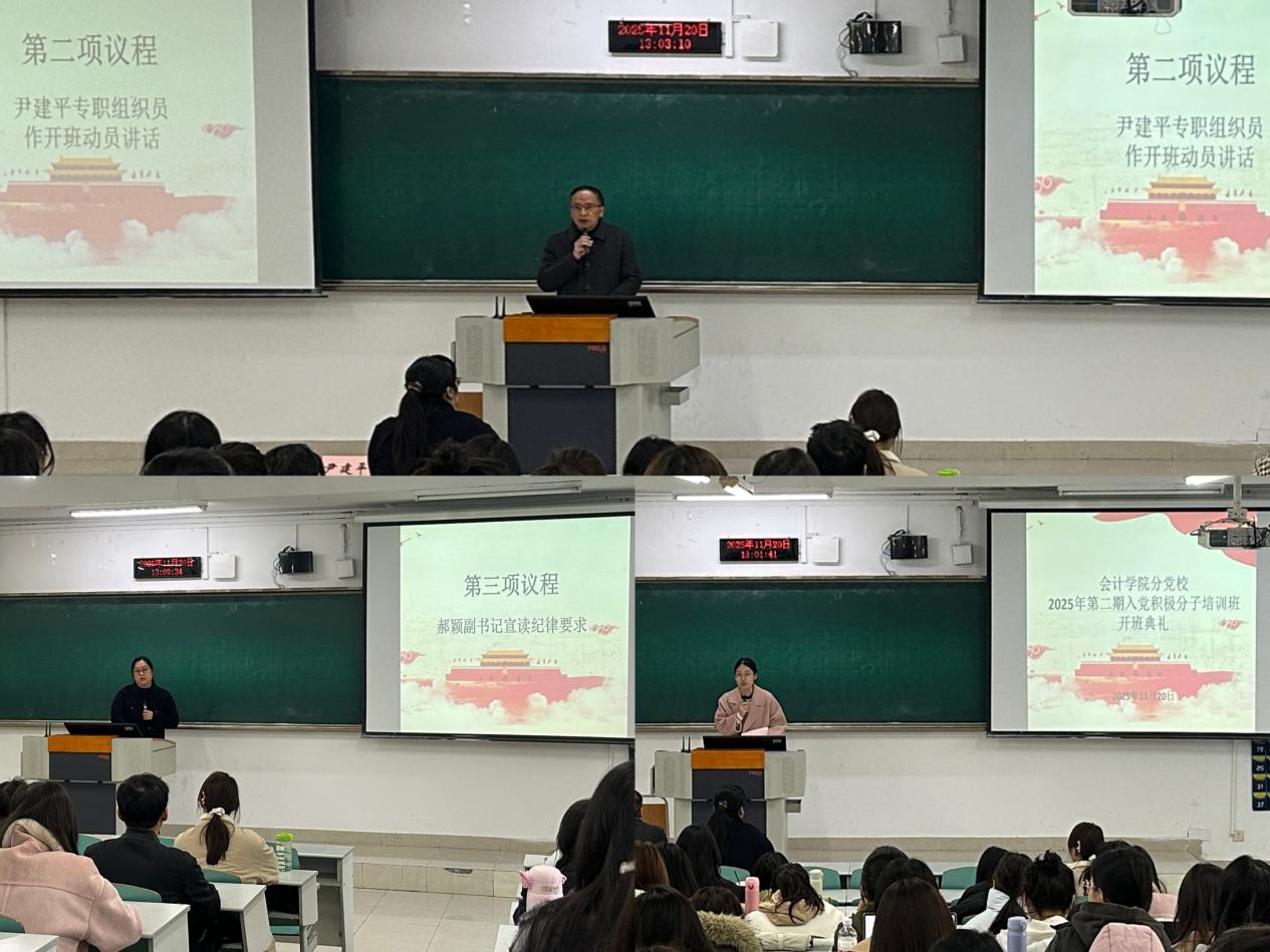 为深入学习贯彻习近平新时代中国特色社会主义思想,全面落实新时代党的建设总要求,切实加强入党积极分子队伍建设,严把党员发展“入口关”,2025年11月20日至22日,我院2025年第二期入党积极分子培训班在博智楼07121教室顺利开展,来自各年级、各专业的126名入党积极分子参加培训。学院专职组织员尹建平、党委副书记郝颖出席开班典礼。