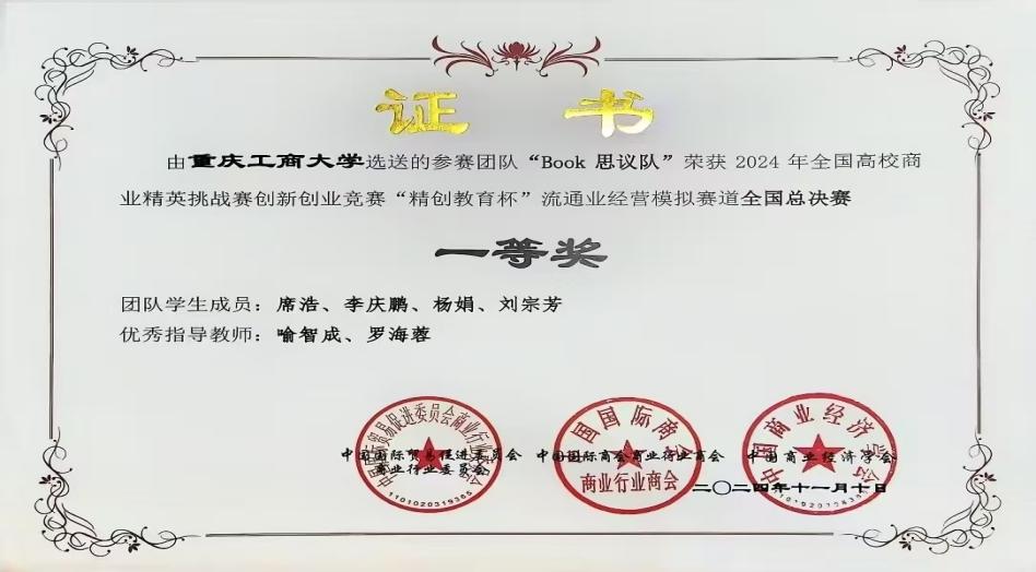 科技创新上,他曾获2025年中国大学生工程实践与创新能力大赛全国特等奖、2024年全国高校商业精英挑战赛(流通业经营模拟)全国一等奖、2024年“知翰杯”全国高校现代企业数字化运营实践与创新挑战赛国家特等奖、2024年重庆市高校企业模拟大赛(本科组)一等奖等高水平奖项。在校期间累计获得国家级与省部级科创竞赛奖项21项,并获“重庆市创新能力优胜个人”“创新能力提升先进个人”“学科竞赛标兵”等荣誉称号。2025年中国大学生工程实践与创新能力大赛的国赛特等奖,是席浩科创履历中最耀眼的一笔——而这份荣光,是两年磨砺的沉淀:大一寒假的联赛集训、大一下的知翰杯特训、大二暑假的留校备战,无数个深夜的网赛复盘、临时换赛制的应急调整,都没能磨灭他的锐气。“第一次省一因意外错过国赛,我就告诉自己:下次要站在最高领奖台。”从遗憾到圆满,他用死磕到底的韧劲,让青春在竞赛场上绽放光芒。