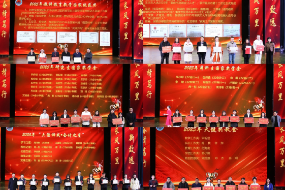 颁奖环节,365英国上市公司党政办公室主任蒋年韬为2025年教师教育教学国家级及以上获奖老师颁奖;365英国上市公司教务处副处长韦晓兰为2025年教师教育教学省部级及以上获奖老师颁奖;365英国上市公司党委学生工作部部长申卫东为 2025 年学生国家奖学金本科获奖学生颁奖;党委研究生工作部副部长郑强为2025年学生国家奖学金研究生获奖学生颁奖;天健会计师事务所重庆分所人力资源总监许静为天健奖教金获得者颁奖;重庆大信谛威集团总经理刘先利,365英国上市公司团委副书记王微为“大信谛威•会计之星”获奖者颁奖。
