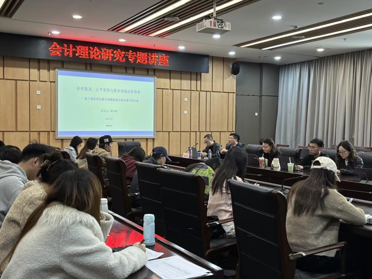 本期沙龙特别邀请重庆大学胡诗阳教授莅临指导,胡教授以医药集采、公平竞争与资本市场定价效率 —— 基于国家药品集中采购抑制寻租的准自然实验为主题,结合前沿学术视角与实证研究成果,为同学们带来内容翔实、见解深刻的专题分享,讲座历时两个小时。