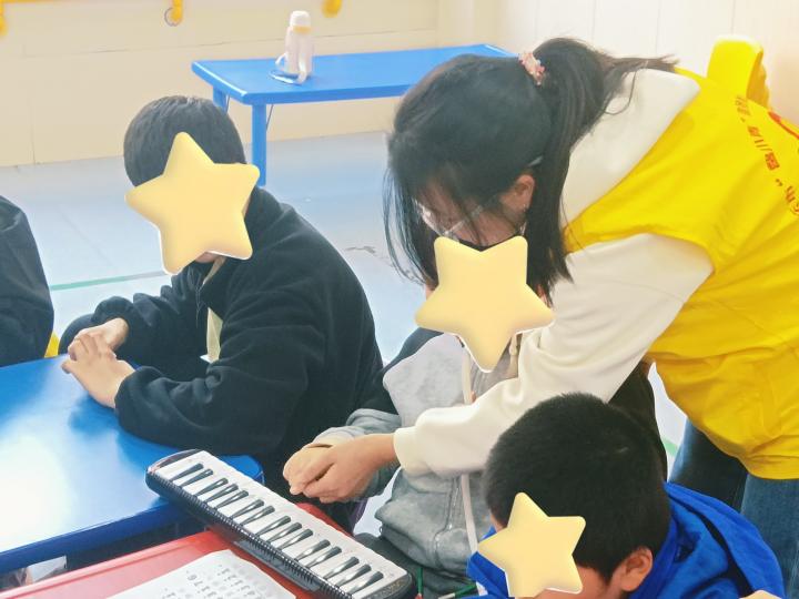另一组志愿者走进课堂担任助教,协助老师开展丰富的教学活动。志愿者们与孩子们围坐一圈,耐心开展基础写字教学,手把手指导孩子们握笔、运笔,帮助他们打下书写基础;绘画环节中,志愿者鼓励孩子们拿起画笔描绘心中色彩,小动物、志愿者笑脸跃然纸上,每一幅作品都满含童真与想象。音乐课堂更是充满欢乐,志愿者们带领孩子们学唱《生日歌》《宝贝宝贝》两首歌曲,用轻快的旋律、温柔的歌声传递美好;同时还开展口风琴教学,手把手教孩子们认识按键、吹奏简单旋律,让孩子们在音乐中感受快乐、收获成长。在志愿者的全程夸赞与鼓励中,孩子们的脸上始终绽放着自信的笑容。