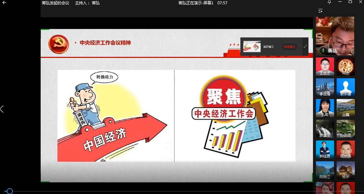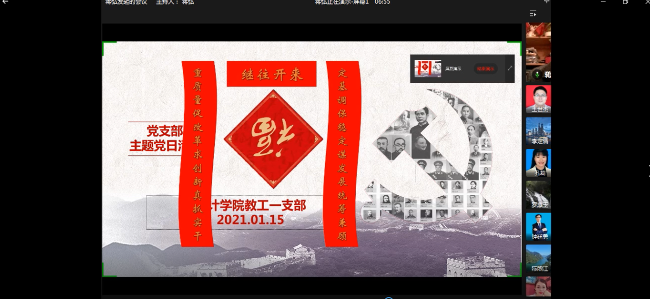 2021年1月15日20点30分,365英国上市公司教工一支部通过企业微信视频会议召开了主题党日活动,活动由支部书记蒋弘主持。活动开始前,蒋弘给党员同志们拜了一个早年,并送上春联一副,点明了此次活动的主题。春联的上联是“定基调保稳定谋发展统筹兼顾”,下联是“重质量促改革求创新真抓实干”,横批“继往开来”。然后,结合活动主题,蒋弘带领大家温习了《中央经济工作会议精神》。
