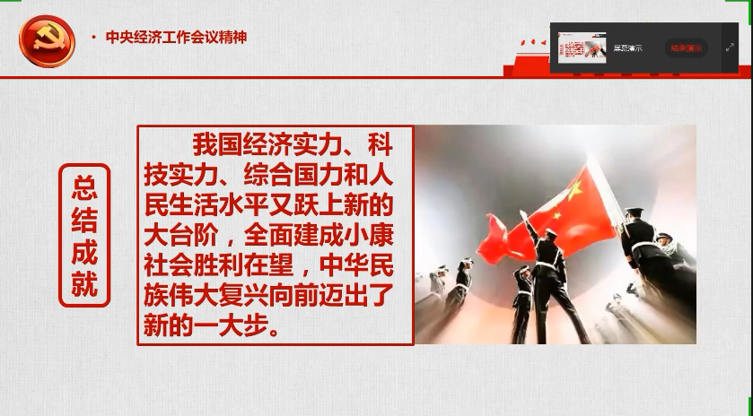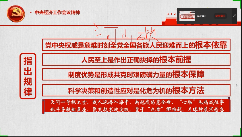 蒋弘指出,经济的发展对一个国家的重要性不言而喻,如果一个国家不重视经济发展,就容易陷入经济衰退、收入下降、失业增加、社会动荡、经济进一步衰退的恶性循环当中。作为目前的世界第二大经济体,我国在经历这场全球范围内的新冠疫情过程中,自身经济表现出了超乎寻常的韧性,原因到底是什么?未来我国的经济将会朝着怎样的一个方向发展?我国将如何在实现第一个百年目标的基础上向第二个百年目标迈进?这些疑问在《会议精神》中都可以找到答案。蒋弘随后从“总结成就”、“指出规律”、“确定思路”、“布置任务”四个方面详细并精辟地解读了《会议精神》。比如,在谈到“党中央权威是危难时刻全党全国各族人民迎难而上的根本依靠”时,他说“为什么说中国共产党是先进的党,首先是因为党的领导集体具有先进性,将精则兵强,将锐则兵勇”;在谈到“人民至上是作出正确抉择的根本前提”时,他说“这就是以人为本,人则向之”,并通过河山硕事件,分析了社会主义制度与资本主义制度的本质区别;而在谈到“科技自立自强是促进发展大局的根本支撑”时,他挑选了2020年我国取得的几个典型科技成就,编写了一个顺口溜:“天问一号探太空,载人深潜入海中;新冠疫苗惠全世,‘心脏’毛病成往事;北斗导航组星座,聚变技术迎突破;量子‘九章’解难题,月球种菜不着急”。通过此次温习,与会党员受益匪浅。