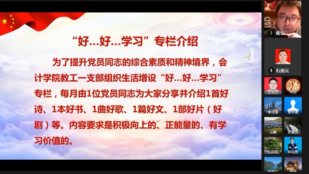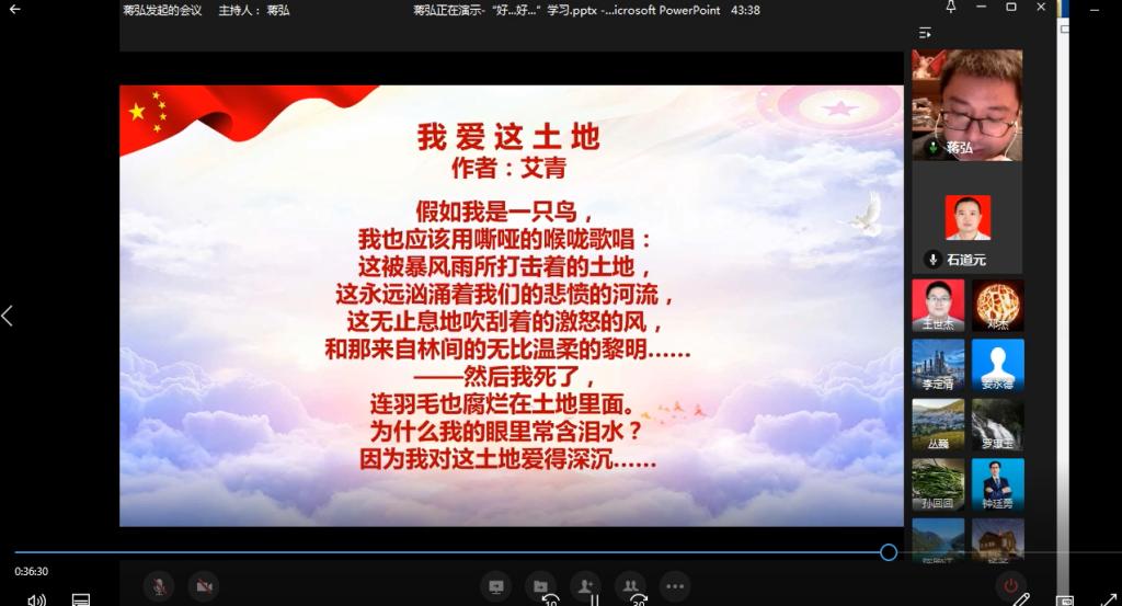 在本次活动中,支部书记蒋弘出于提升支部党员综合素质和精神境界的目的,增设了“好…好…学习”专栏,未来该专栏会构成组织生活的常态化内容之一。该专栏会在每月的组织生活中,安排一位党员为大家分享并介绍内容积极向上、正能量、有学习价值的一首好诗、一本好书、一曲好歌、一篇好文或一部好片(好剧)等。作为专栏设立者,蒋弘带头分享并介绍了由著名诗人艾青所写的爱国诗歌《我爱这土地》。