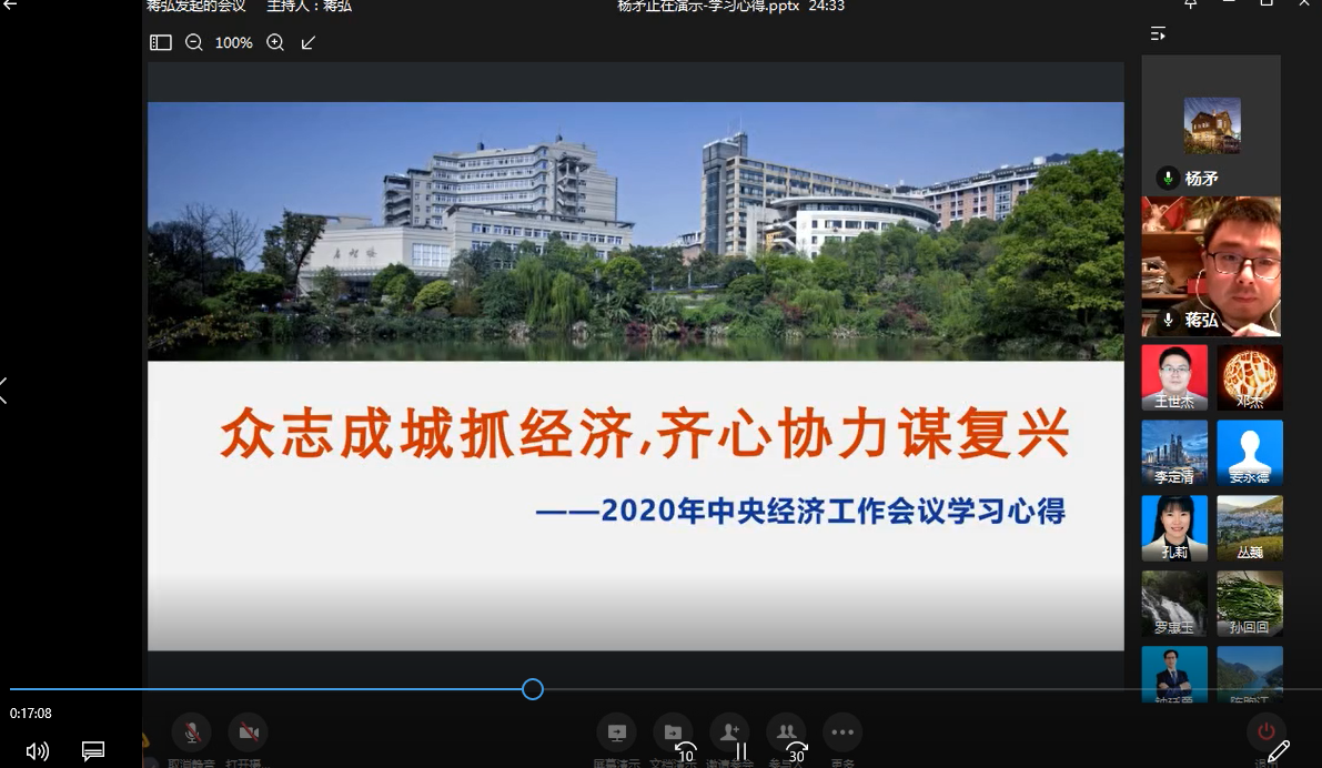 随后,杨矛和石道元各自分享了学习心得。杨矛以“众志成城抓经济,齐心协力谋复兴”为题,较详细地分析了当前世界经济局势,并指出了“中央经济工作会议”的重要意义。石道元则从疫情防控和经济恢复两方面谈了谈自身的感受。他认为,中央经济工作会议既是对2020年我国经济状况的全面总结,也是对2021年我国经济工作的良好布局,是中国作为世界大国给当今世界经济复苏提供的一针稳定剂。