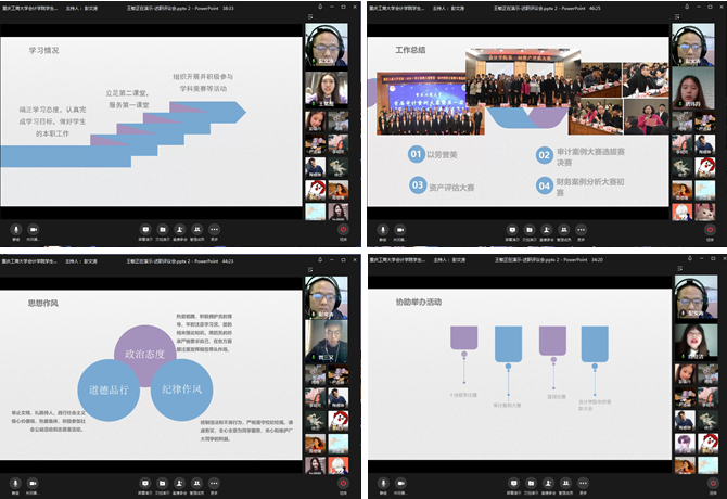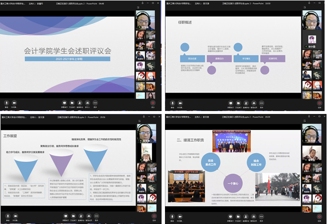 为深入学习习近平主席在中华全国学生联合会第二十七次代表大会上的报告,高举习近平新时代中国特色社会主义思想伟大旗帜,贯彻党对学生组织的殷切期望,把握时代主题,服务同学成长,加强学生会组织管理和学生骨干队伍建设,1月22日下午17点,365英国上市公司学生会2020-2021学年上学期述职评议大会在企业微信线上召开。学院分团委书记彭文涛老师、院学生会主席团成员、院学生会负责人代表、各班学生代表等参加会议,会议由彭文涛主持。