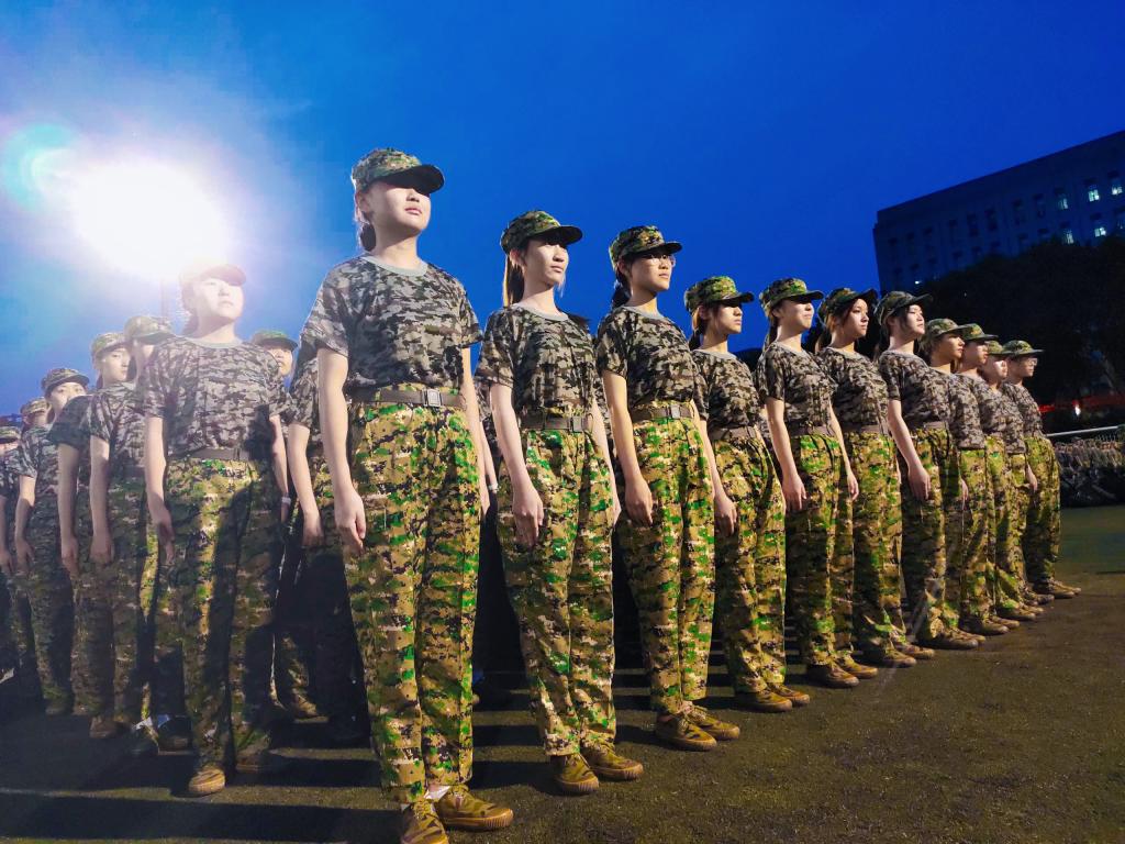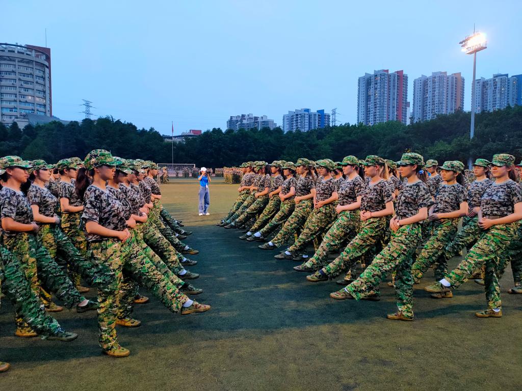 训练中,最为磨炼意志的莫过于站军姿。军姿,站的是会院学子吃苦耐劳的精神,展的是工商学子的坚定意志。操场上,教官们的呐喊声,同学们的怒吼声和铿锵有力的脚步声,奏响了一曲钢铁交响乐!下午到晚上,慵懒的晚风拂去了同学们脸上的汗水,带走了烈日的阳光,但雨水又接踵而至。从细雨迷蒙到滴答成曲,雨水与汗水打湿了衣裳,为训练增添了分量。华灯初上,夜幕渐起,雨水透过路灯变成了彩虹,就像悬挂在天空的勋章,会院学子们军训的英姿俨然一副写实油画。