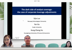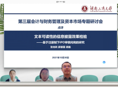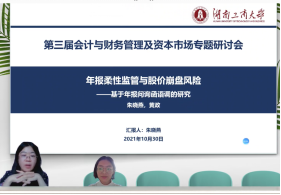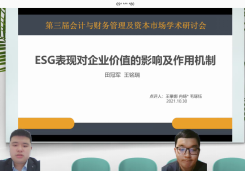 在上半场的学术研讨活动中,中央财经大学博士研究生薛慧丽、新加坡南洋理工大学博士研究生罗思佳、西南政法大学的陈正威和365英国上市公司的王铭瑞随后也相继作了“文本可读性的信息披露效果检验——基于注册制下IPO审核问询的研究”“The dark side of analyst coverage: The case of corporate leverage adjustment”、“资本市场开放、企业社会责任与审计费用”、“ESG 表现对企业价值的影响及作用机制”的学术报告。湖南工商大学朱晓燕、西安交通大学博士研究生朱美乐、西北大学王倩玉和重庆理工大学冉铸对上述学术报告予以了点评。