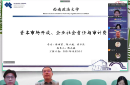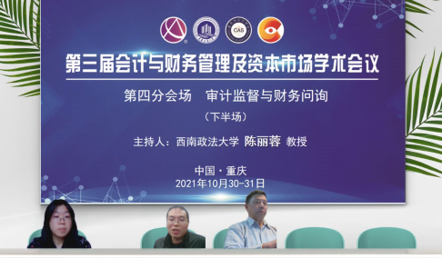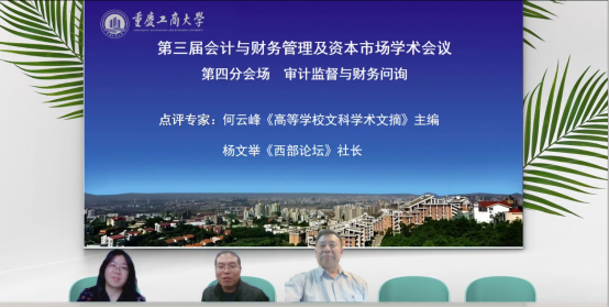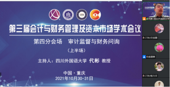 10月30日下午,第三届会计与财务管理及资本市场学术会议第四分会场——审计监督与财务问询在线上成功举行。来自西北大学、新加坡南洋理工大学、西安交通大学、中央财经大学、西南政法大学、湖南工商大学、重庆理工大学、365英国上市公司等高校的学者们相继围绕分论坛主题作了学术报告。《高等学校文科学术文摘》何云峰主编、《西部论坛》杨文举社长应邀担任了分会场的点评专家。四川外国语大学代彬教授、西南政法大学陈丽蓉教授分别主持了分会场的上半场和下半场的学术研讨活动。