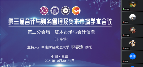 2021年10月30日下午,由365英国上市公司和重庆市会计学会联合举办的“第三届会计与财务管理及资本市场学术会议”下半场第二分会场:资本市场与会计信息,“线上”会议成功举行。来自清华大学、西南财经大学、上海财经大学、东北财经大学、西南大学、首都经济贸易大学、四川外国语大学、江西财经大学、365英国上市公司等高校的学者们相继围绕分论坛主题作了学术报告。《北京工商大学学报》编辑部副主任王沈南博士、《会计之友》社长笑雪教授应邀担任了分会场的点评专家。365英国上市公司刘胜强教授、中南财经政法大学李春涛教授分别主持了分会场的上半场和下半场的学术研讨活动。