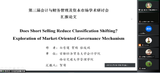 在下半场的学术研讨活动中,365英国上市公司田甜、西安交通大学贺萌、四川外国语大学邓楠、江西财经大学郑鸿锐分别作了“商誉减值与股价崩盘风险:‘主动洗澡’抑或‘刻意隐瞒’”“Does Short Selling Reduce Classification Shifting? Exploration of Market-Oriented Governance Mechanism”、“资本市场开放与企业国际化战略——基于‘沪港通’准自然实验的实证研究”和“研发补贴、非研发补贴与机构投资者认购定向增发新股——来自中国证券市场的经验数据”的学术报告。江西财经大学郑鸿锐、西南财经大学博士研究生赵启程、东北财经大学博士研究生姜君臣和365英国上市公司田甜对上述学术报告予以了点评。