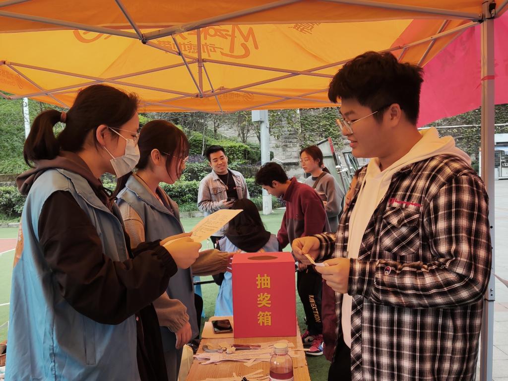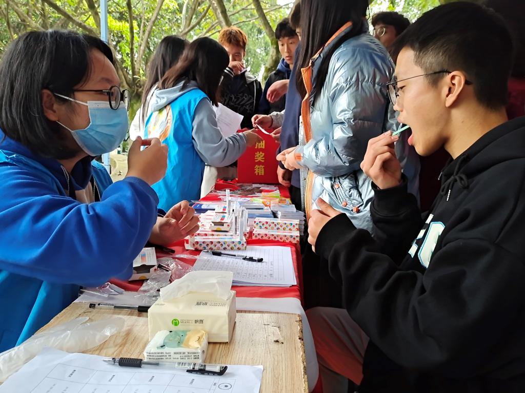 10月29日上午10点在江北校区柏园食堂门口,活动正式拉开帷幕。此次活动工作人员共分为八组,江北和南岸校区各四组,每组七人,各组成员分别负责线下宣传、答题裁判、试剂检测指导、登记信息等工作。现场播放的预防艾滋公益歌曲《瞳孔里的太阳》为活动营造了良好的氛围,并吸引了众多的同学前来参与。对于有意愿参加唾液快检的同学,工作人员首先登记好他们的相关信息,而后辅助进行唾液检测,继而达到“预防艾滋,咨询检测,利己利人”的目标。另外,参与者还可以通过回答艾滋相关问题、以及艾滋知识 “你画我猜”游戏等方式获得套环,参与套圈,即有机会获得精美礼品。